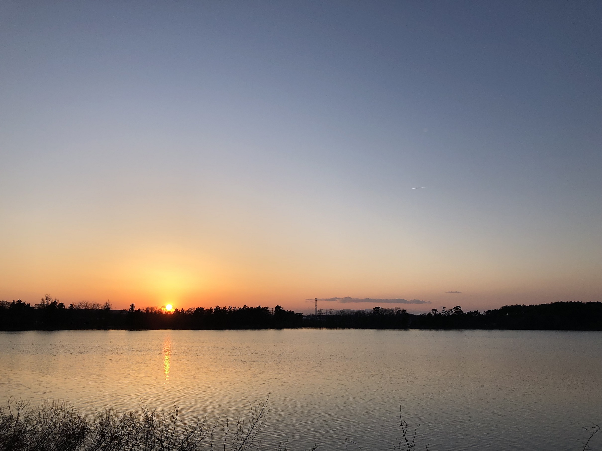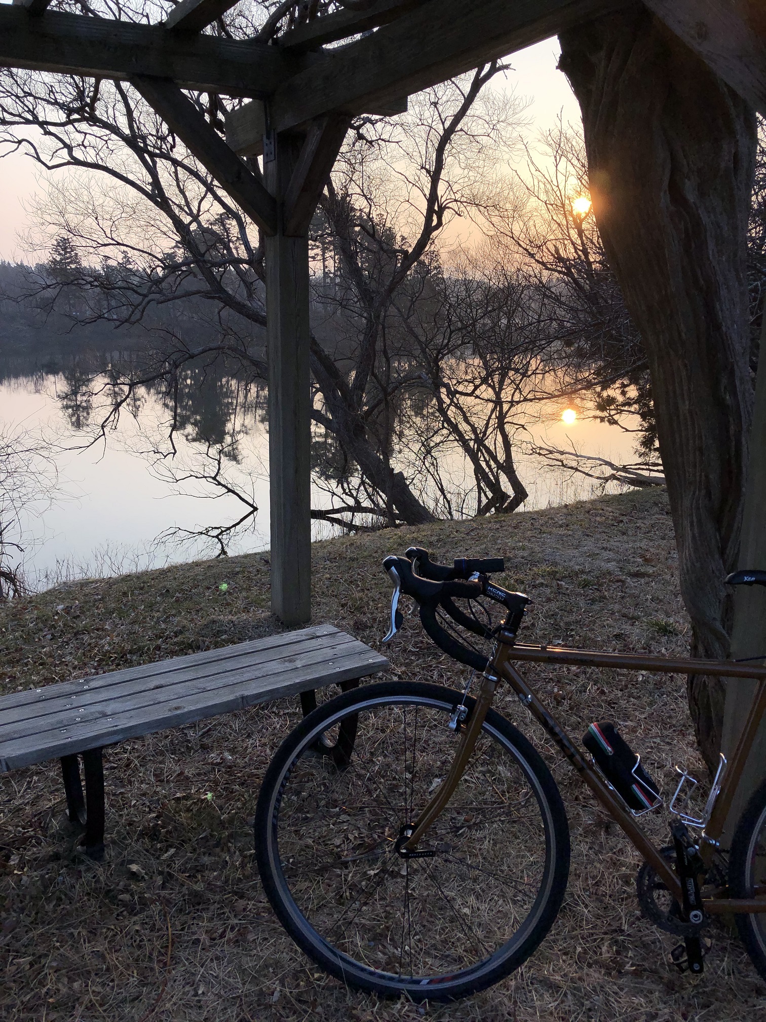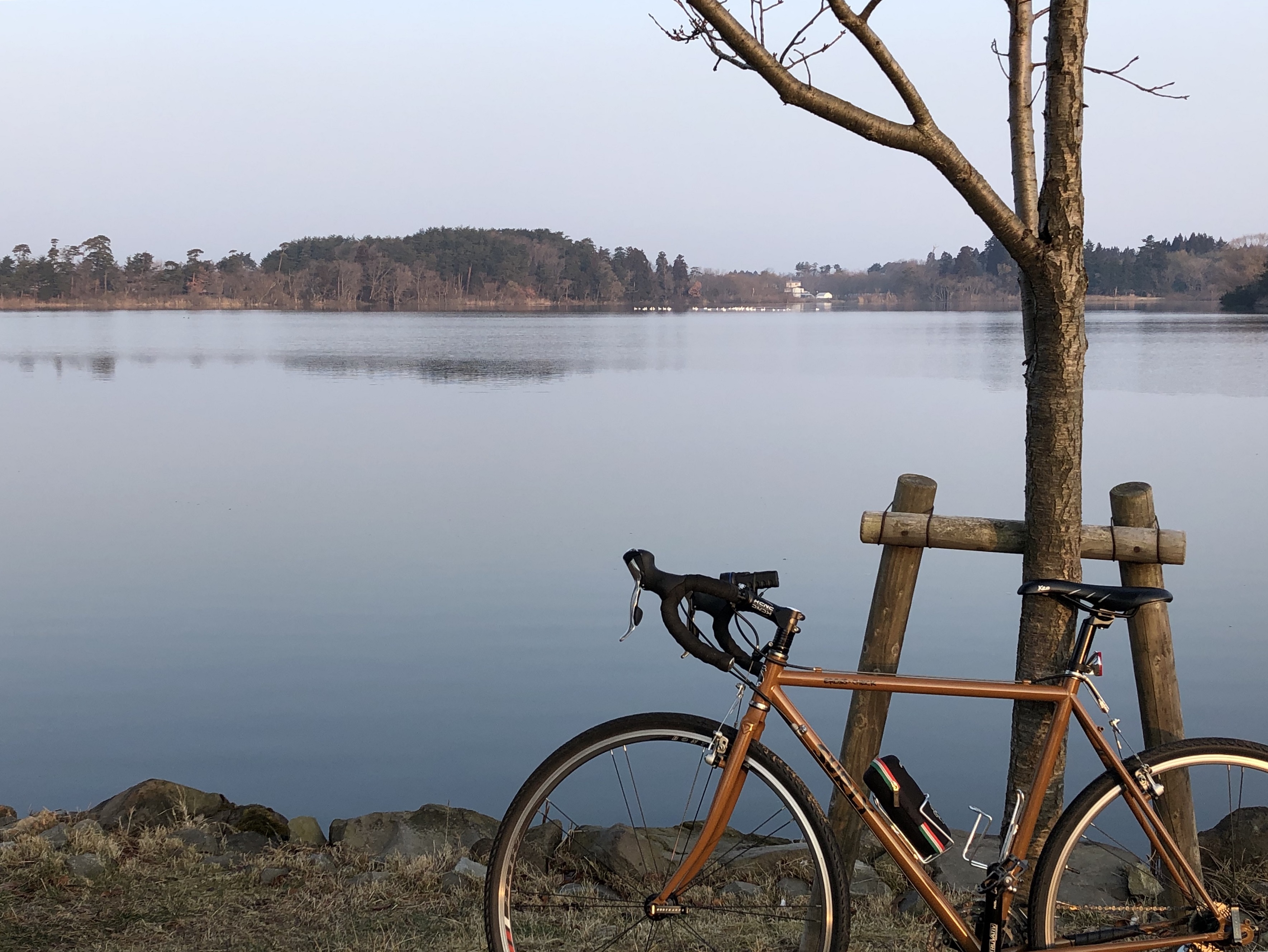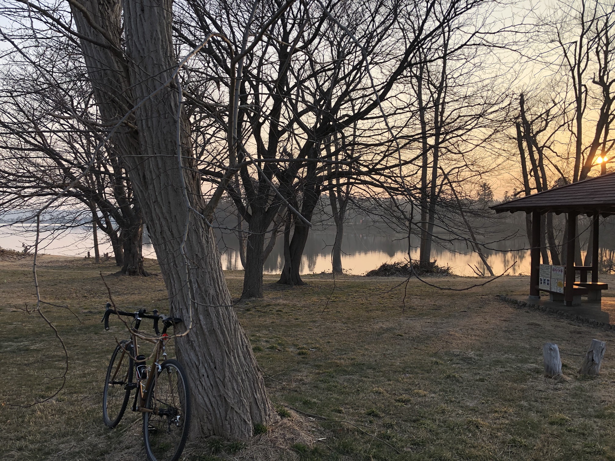 木々の間から見える湖面に反射した朝日が綺麗だったのでパチリ☆彡