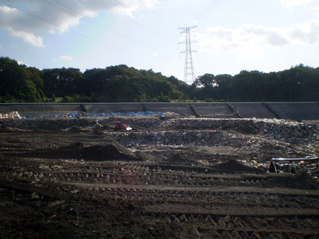 自主基準に適合したものは即日埋立され、一日の作業終了時に50cmの覆土を行います。 さらに、放射性物質の吸着特性がある二酸化ケイ素を豊富に含んだ覆土材により放射性物質の浸透を遮断します。