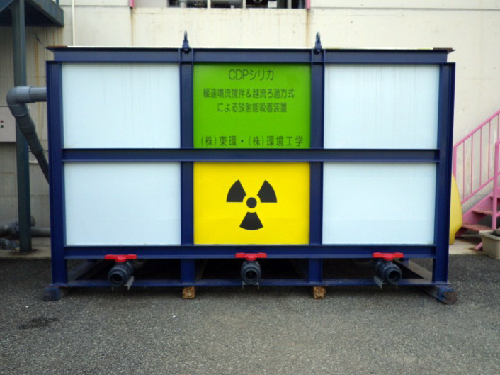 万一、浸出原水と放流前の水が異常値の場合、通常処理ラインから「セシウム・ヨウ素除去槽」に切り替え、 CDPシリカでこれらを放射能不検出レベルまで吸着除去します。脱水汚泥が濃縮によって異常値となった場合は、 緊急対策としてコンクリート固化し、線量を10分の1以下に抑えます。
