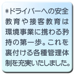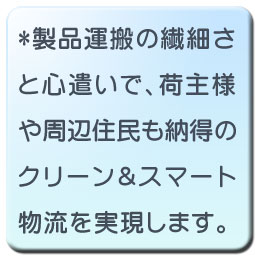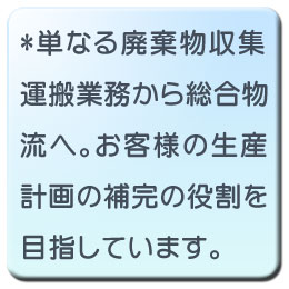 廃棄物収集運搬の概念を超えた環境配慮型総合物流の確立 私たちが考える物流は、従来の廃棄物収集運搬の形態と大きく異なります。 一般貨物便と同等以上の清潔なイメージを大切にして、お預かりした貨物をSafetyかつEcologyにハンドリングします。